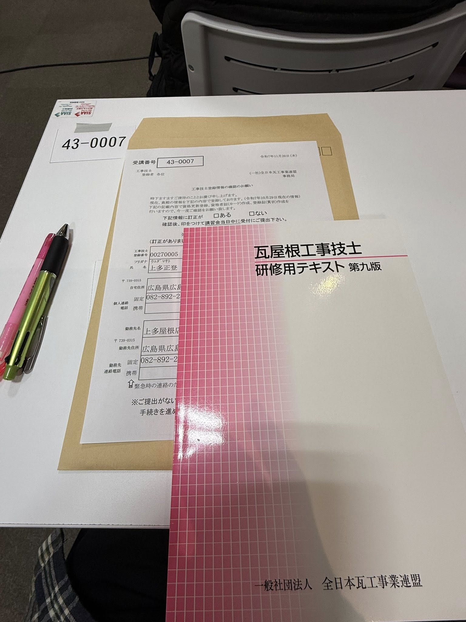 瓦工事技士の資格更新のため熊本へ 2025.11.24 日々の出来事 先週、瓦工事技士の資格更新の為、熊本へ講習に行きました。広島では講習会がなく、大阪か、熊本かというところ、熊本を選びました。 妻には内緒で、帰りに柳川に寄り、お昼を贅沢させてもらいました。 Tweet Share Hatena Pocket RSS feedly Pin it 新年あけましておめでとうございます。 前の記事 薄型スレート屋根、ノンアスベストになってから本当にモロイ。 次の記事